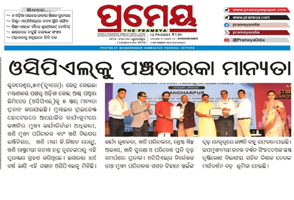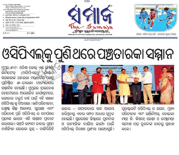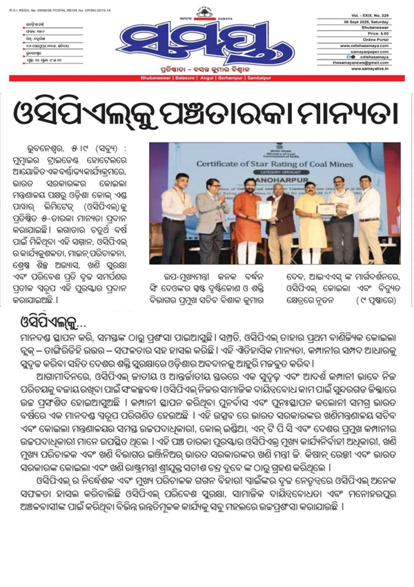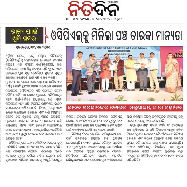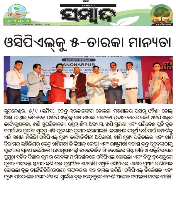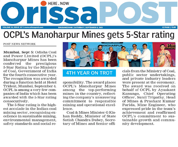 "Manoharpur Coal Mine of OCPL has been awarded with 5-Star rating by Ministry of Coal, GoI, for the fourth time in a row. It is an unique recognition for our efficient, effective, environment friendly and sustainable Coal mining practices implemented in our Manoharpur Coal Mine."